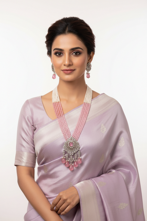 Pink Floral Pendant Real Freshwater Pearl Mala Set - 20-22 Inch - Handmade -